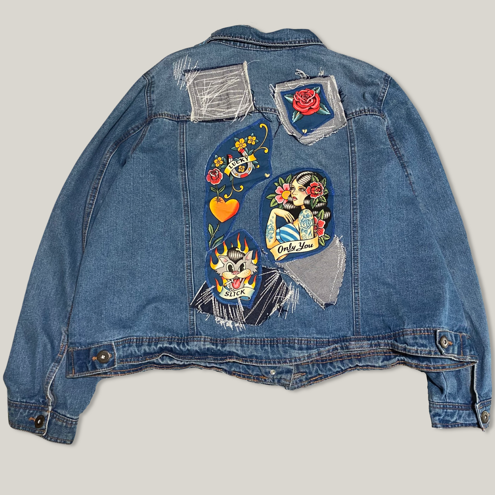 This 1/1 Denim Jacket is the perfect sustainable expression of your individual style. Crafted from Levi denim scraps which are meticulously sewn into a unique patchwork collage, this jacket is an artful piece of repurposed fabric. Comfortably snug fit and an eye-catching design make the 1/1 Denim Jacket a must-have.